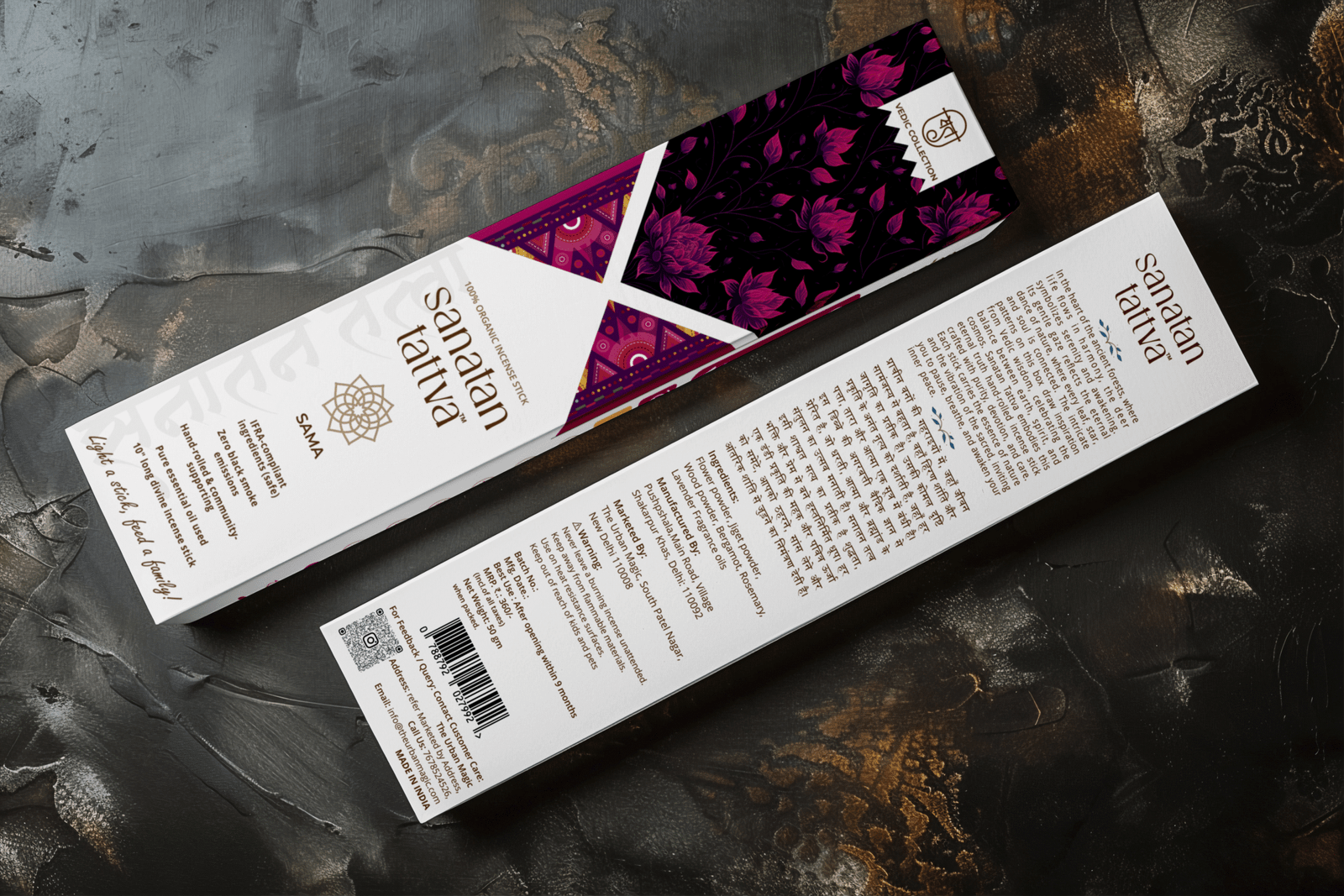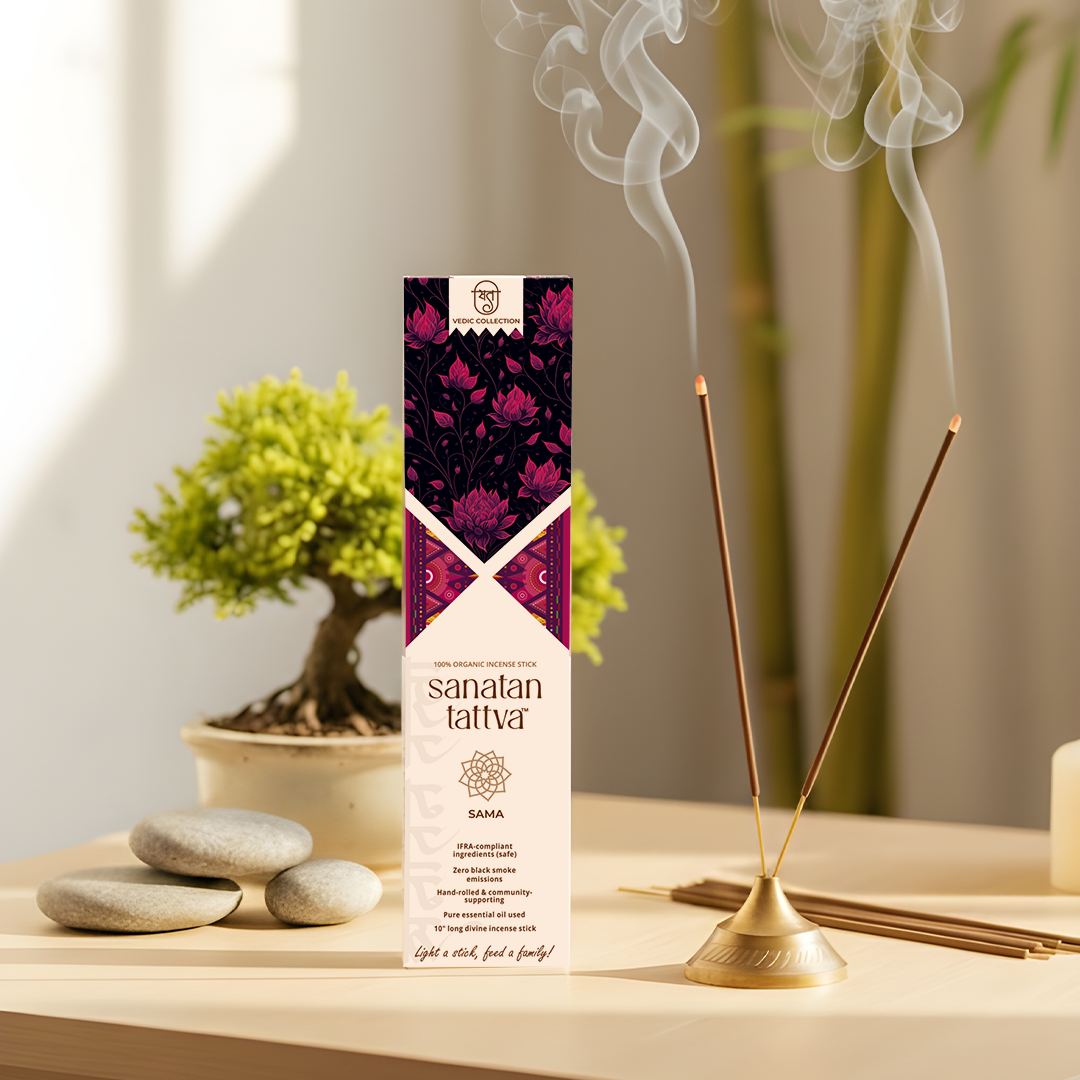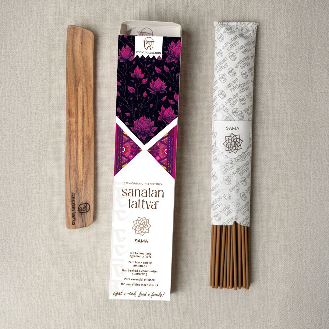 Sanatan Tattva SAMA Agarbatti is a sacred blend designed to restore peace and equilibrium in your spiritual space. Rooted in the timeless principles of Sanatan Dharma, each stick is hand-rolled with devotion using 100% organic ingredients and a zero-black-smoke formula. SAMA — meaning balance and serenity — is your companion for mindful rituals, meditation, and sattvic living.